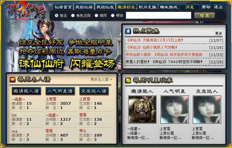 《诛仙2》游戏内置社区平台系统——诛仙仙府是一个为所有《诛仙2》玩家提供交友、互动的休闲娱乐平台。通过它,不仅可以在全区全服结交好友,更有可能登上“诛仙名人谱”,成为《诛仙2》的明星玩家,并且还可以获得海量的仙府积分,换取点卡、周边等丰厚奖励。