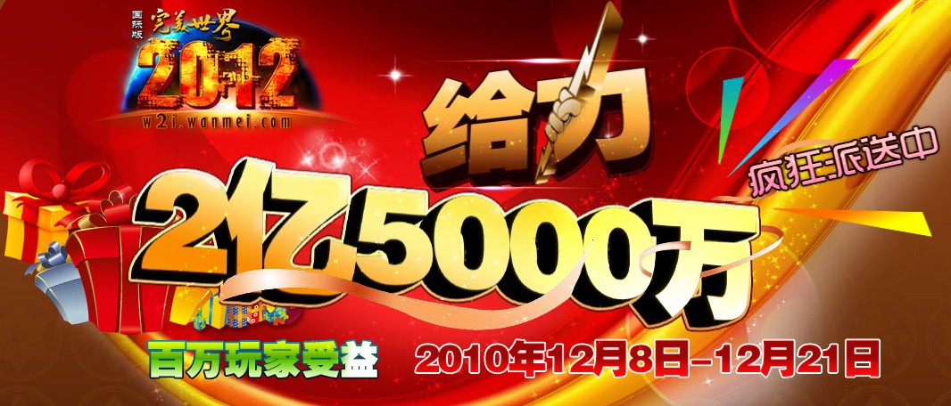 史上最强回馈,2.5亿RMB给力派送!《完美世界国际版2012》12月8日创世启航,“亿万元宝大回馈”活动届时同步开启,让我们共同期待精彩的游戏内容,赢取丰厚的绝世豪礼吧!