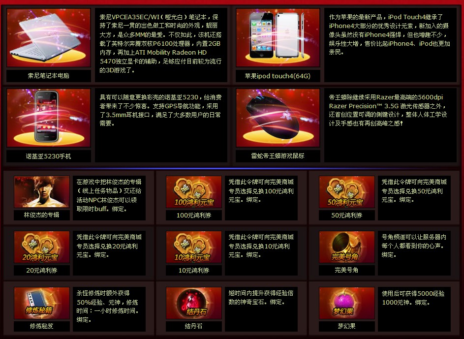 “亿万元宝大回馈”活动将以三种不同活动形式为新老玩家送上惊喜,倾情回馈2.5亿RMB!“年度鸿利大回馈,亿万元宝天天领”活动,鸿利元宝倾情回馈,尽显玩家尊贵待遇;“畅游新世界,天天抽大奖”活动,每天免费抽大奖,超值好礼等你拿,笔记本电脑、时尚手机统统搬回家;“新服公测狂欢周,每天大礼送不停”活动,幸运大奖天天有,新服狂欢等你来。活动奖励包括价值2.5亿RMB元宝大奖(1元宝=1RMB)、ipod touch4、雷蛇帝王蟒鼠标等,让每一位入驻《完美世界国际版2012》玩家能够在重重惊喜之下,感受全新版本的游戏乐趣!