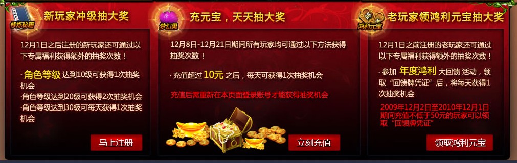 《完美世界国际版2012》“年度鸿利大回馈,亿万元宝天天领”活动,面向百万玩家倾情送礼。玩家符合条件即可在活动页面领取“回馈凭证牌”,拿到凭证后玩家可在各大主城“完美商城专员”处领取鸿利元宝。本次活动共计百万玩家受益,坐收2.5亿鸿利元宝,单人最高可领取500鸿利元宝。参加年度鸿利回馈活动的玩家,每天除了能够领取鸿利元宝外,还将获赠抽奖机会,十分给力的回馈活动,等待你的参与!