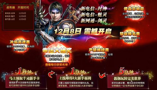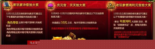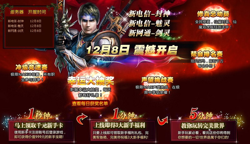 12月8日12:00,三大新服新电信-封神、新电信-魅灵、新网通-剑灵准时开启,《完美世界国际版2012》为入驻新服的玩家准备了丰富多彩的活动,同时送上超值游戏大礼!新服上线狂欢周,每天大礼送不停。活动分为“幸运大抽奖”、“冲击竞速赛”、“声望挑战赛”、“修真总动员”以及“帮会排名赛”。活动将通过多种的形式为玩家献礼,诺基亚手机、点卡,极品坐骑等好礼让你拿到手软!在游戏的过程中,惊喜和幸运奖与你相伴。