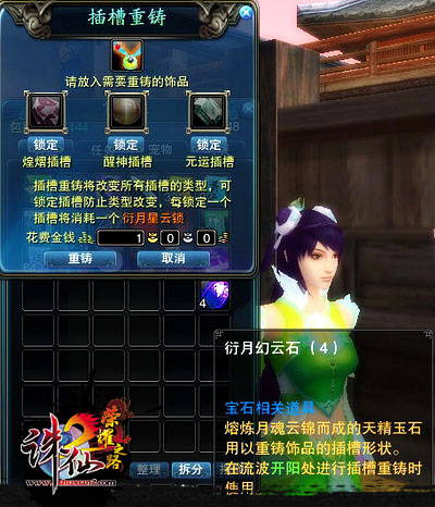 如果你想获得其他属性的插槽,那么到“天帝宝库”寻得“衍月幻云石”,就可让你的装备插槽属性重新随机生成。而使用珍宝“衍月星云锁”,还可锁定某一个插槽的属性。