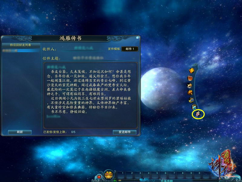 第一步:点击《诛仙前传》游戏中的功能按钮,打开“鸿雁传书”界面!